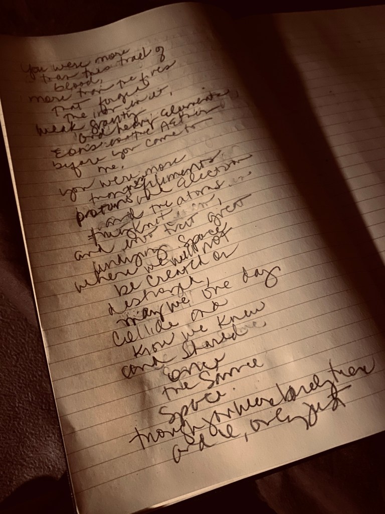 When you stare at the stars long enough they start to do this silly little swim. For a moment, maybe a millisecond, you believe what you’re seeing is true. Your heart jumps and you rub your eyes and you try to refocus them. What did I see? Why? Between one star and another, you see that there has been no change in distance or location. You breathe deep. You may be still, but you are always making micro movements. Your heartbeat, inhale and exhale of your lungs. Your body is a chorus of stirring. Stillness is just another state of movement. Logically you know this. But your mind keeps being dragged back to that initial feeling of belief. because it exhilarates you. Because you want to make a home in the feeling. Fires in a Black Sea swirling just for you.